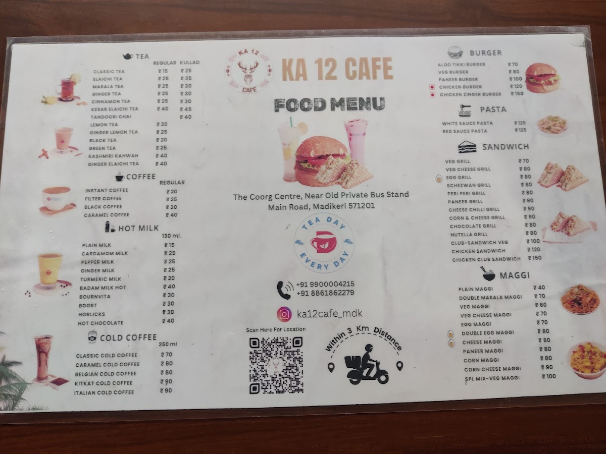 Introducing the menu at Tea Day - KA12 CAFE, a vibrant gem located in Madikeri. This cafe offers a delightful range of mouthwatering food and beverages that cater to every palate. Whether you're in the mood for a refreshing cold coffee or an indulgent Oreo shake, the drinks are crafted to perfection. Spice enthusiasts will love the peri peri momos, celebrated for their balanced flavors and just the right kick. Don't miss out on their exquisite flavored teas, ideal for tea lovers looking to explore unique tastes.